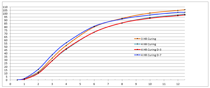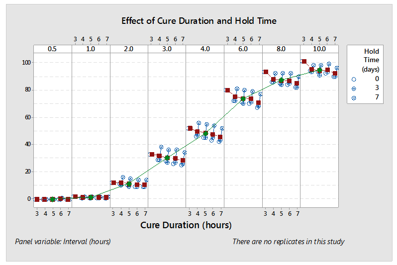 In the following (redacted) example, the process SME’s designed and executed a study to understand the impact of “cure duration” and “hold time” on cumulative release in each interval. The process SME’s released the study results and analysis to the broader team in a spreadsheet of four (4) worksheets shown in Figure 1 – Figure 4. While all the information is present, this analysis technique makes it difficult to understand the effect/significance of each variable (flipping back and forth between worksheets) and nearly impossible to understand their interactions. Consequently, the process SME’s spent far too much time reaching even cursory conclusions and they completely missed some greater insights lurking in the data. A subsequent analysis by the DASME told the story in one graph, shown in Figure 5. The effect/significance of cure and hold times are readily apparent, as are their interactions and their change by interval, which provide the process SME with a basis for hypothesizing and ranking likely causes.