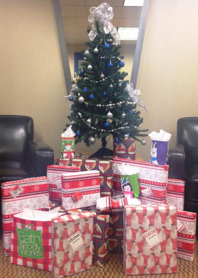 The office headquarters partnered with Guadalupe Center to make the holidays brighter for a family in need. Pictured are all the presents donated under our office tree.