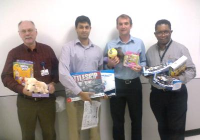A team of consultants including (from left) Larry Nelson, Ashwin Mohan, Jeff Haughey, and Martin Jenkins put together a donation package for Toys for Tots in McPherson, KS.