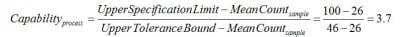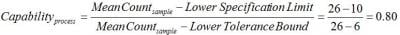 If we were instead concerned with meeting a lower limit on particle counts rather than staying below a maximum value, we would simply subtract k1 from the mean instead of adding as we did in the example above. In this case, the lower 99% single-sided tolerance bound calculated with 95% confidence is 6. If the lower specification limit in this case is 10, then the capability is:
