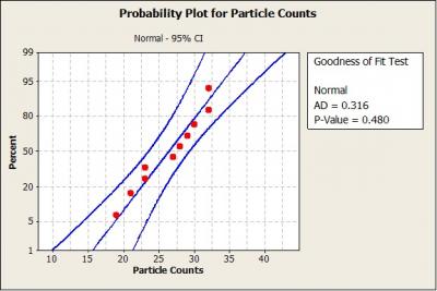 Thus, the upper 99% single-sided tolerance bound calculated with 95% confidence is 46. What this means is that for 95 out of 100 samples of size 10 taken from the same population, we would only expect 1% to have a particle count greater than 46.